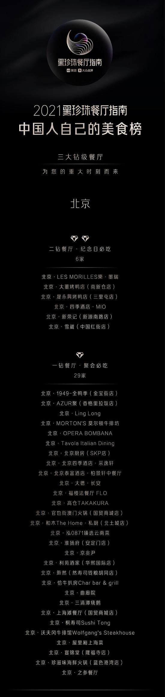 从堪称纪念日必吃的二钻餐厅北京大董烤鸭店与新荣记,再到聚会必吃的一钻餐厅淮扬府与京兆尹等,今年北京有35家餐厅入选“2021黑珍珠榜单”,不知这些餐厅您都品尝过没有?