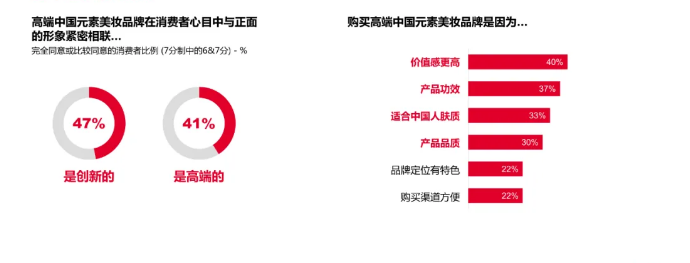 高端中国元素美妆在中国消费者眼中是以创新和高端的形象联系在一起的,消费者选择高端中国元素美妆是为了追求更好的价值感、功效和品质,同时也认为会更加适合中国人的肤质,还有小部分人认为是产品的定位有特色和购买的渠道方便。