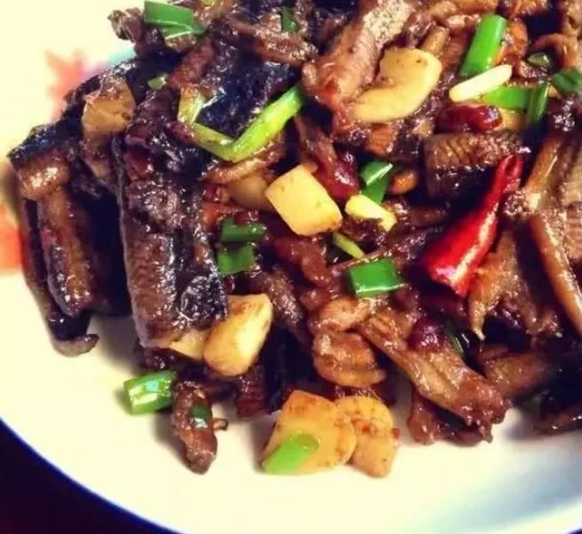 干豆角红烧肉,玉米烧排骨,酱爆黄鳝,青蒜炒肚丝
