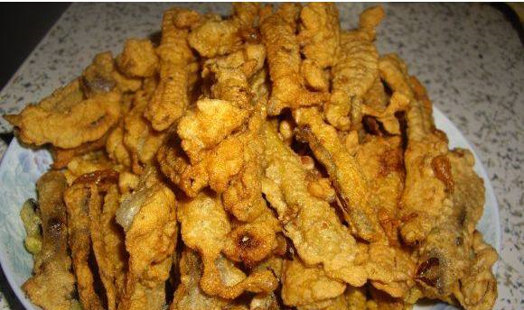 炸茄鱼炸茄鱼,新鲜的茄子,洗净,去皮,然后用刀子切成小条,放入适量的盐,搅拌一会,杀杀水份,用手抓一下去水,然后放入十三香,抓匀。一次加入两个鸡蛋,适量的面粉,搅拌均匀,待茄条挂糊。然后油锅里边,待油烧到6成热,下油锅炸至表面变色,捞出。等到油烧至九成热,回锅复炸一边,指标表面金黄,变硬,即可捞出。沾上蒜汁,配上冰镇啤酒,绝对是招待亲朋好友的美味。