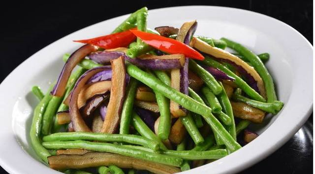 茄子炒豆角茄子炒豆角是一道家常菜肴,是以茄子和豆角为主要材料,干辣椒、蒜粒、姜末、生抽等为辅料炒制而成的一道美食。成品的茄子炒豆角口味偏咸,偏辣,但具有丰富的营养价值。先把茄子切成小长条,先放盐水中浸泡,去除有毒物质.长豆夹洗干净,切成小拇指长的段.几颗大蒜备用.水烧开,把切好的豆角放入,过水几分钟吧,捞起放冷水中淋一下。锅稍多放点油,放入姜末,干辣椒再把捞起的漏干水的茄子倒入锅中.翻炒,待变色,有点软时,放已过水的豆角,大蒜,生抽,再翻炒后放少量的盐,鸡精起锅。