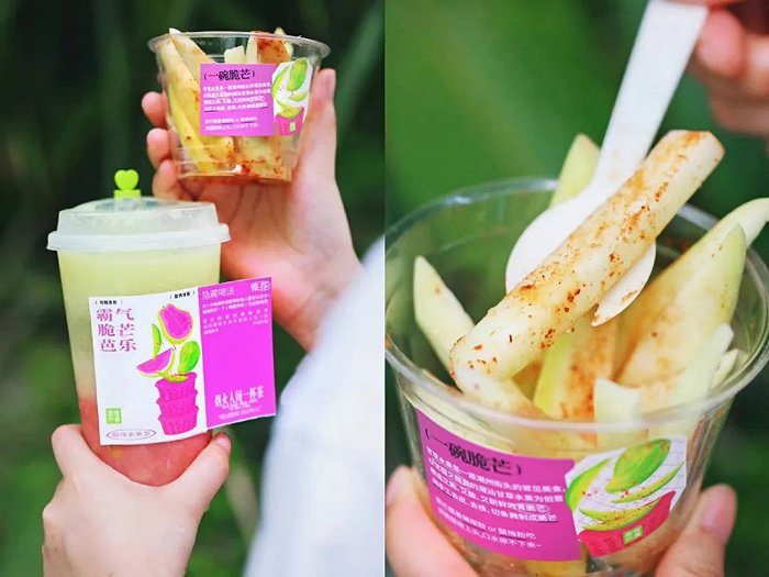 今年3月,奈雪的茶曾以潮汕甘草水果为灵感,上新了一款“霸气脆芒芭乐”;茶百道以传统的台湾小吃蛋蜜汁为灵感研发的“芒果蜜汁蛋”,都包含地域特色,让消费者充满了新奇感。