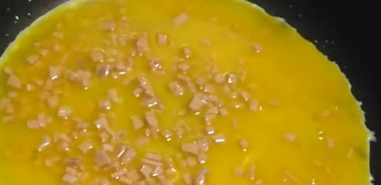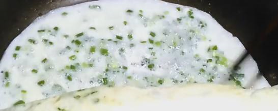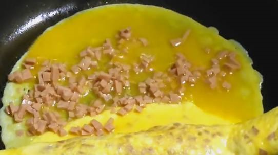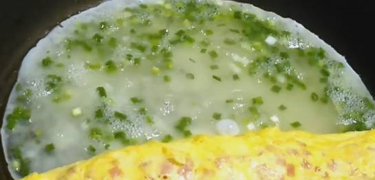 煎至表面凝固,关火,然后卷起来.然后开小火,接着把剩下的蛋黄液也倒入.