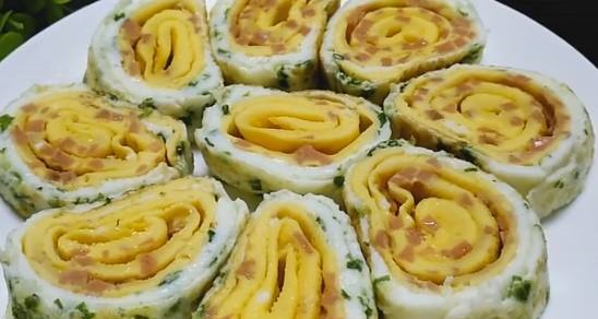 定型以后,接着卷起来,锅里再刷点油,把剩下的蛋清都倒入锅里.定型以后,继续卷好.