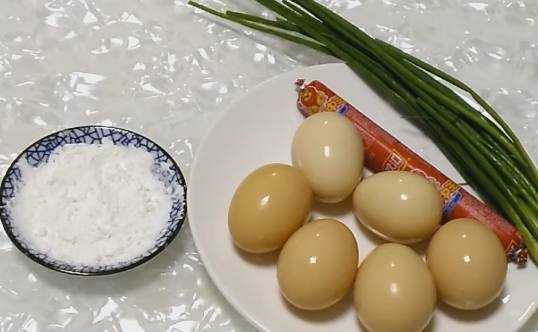 在营养界,鸡蛋一直有“全营养食品”的美称,杂志甚至为鸡蛋戴上了“世界上最营养早餐”的殊荣。通常早餐中的鸡蛋为了最大限度的保留营养我们会用水煮的方式,但是吃多了白煮蛋难免会有点乏味,不妨试着换个新花样,来点新吃法.今天跟大家分享这道煎蛋卷,快手方便,只需要几分钟,营养可口、搭配丰富.先准备好食材.玉米淀粉,鸡蛋,火腿肠,葱.