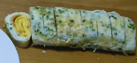 卷好以后,用铲子两面都压一下,不会散,然后放到菜板上切成一块一块的