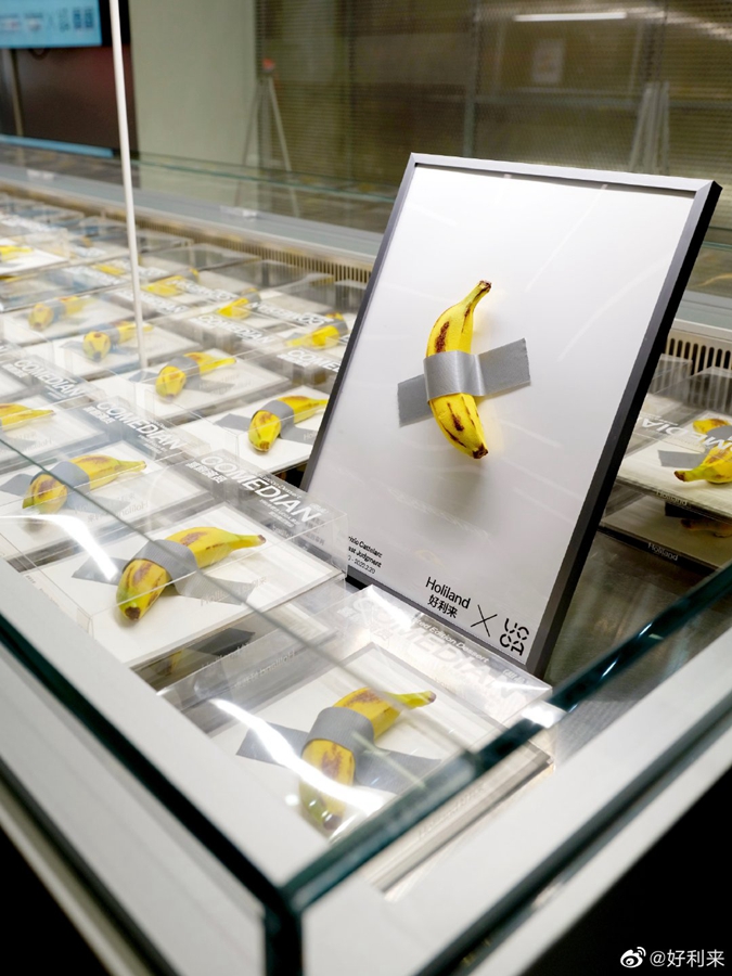 去年,北京尤伦斯当代艺术中心(UCCA)的“莫瑞吉奥·卡特兰:最后的审判”展览风靡一时,海报上的艺术作品《喜剧演员》是一根备受关注与争议的香蕉。艺术家卡特兰用银色胶带把一根香蕉贴在墙上,卖了12万美元。这件标示性极强的作品是当代艺术的热门话题,也成为好利来联名UCCA限定甜品的灵感。
