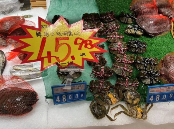 在水产柜台上,已经有二十几只大闸蟹,有公有母,重量在2两左右,售价48元/只。“个头越大,等级越高。比如二级的蟹就比三级的个头大。”