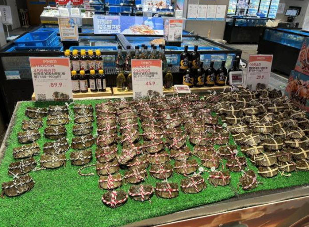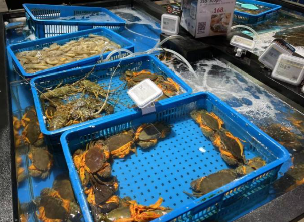 超市的工作人员说,这里的大闸蟹是昨天上市的,因为这边的客流较小,每天都量不多,“就二十几只,售完即止。估计明天中秋买的人会多一些,也会多进一些货。”