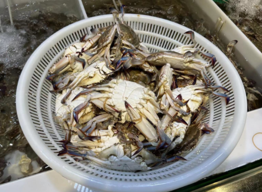 农贸市场的几个水产摊位,螃蟹的情况都差不多,摆在显眼位置的都是梭子蟹,“这个六月黄有二两半,想吃的话可以尝尝,不过建议还是买梭子蟹,肉多。”