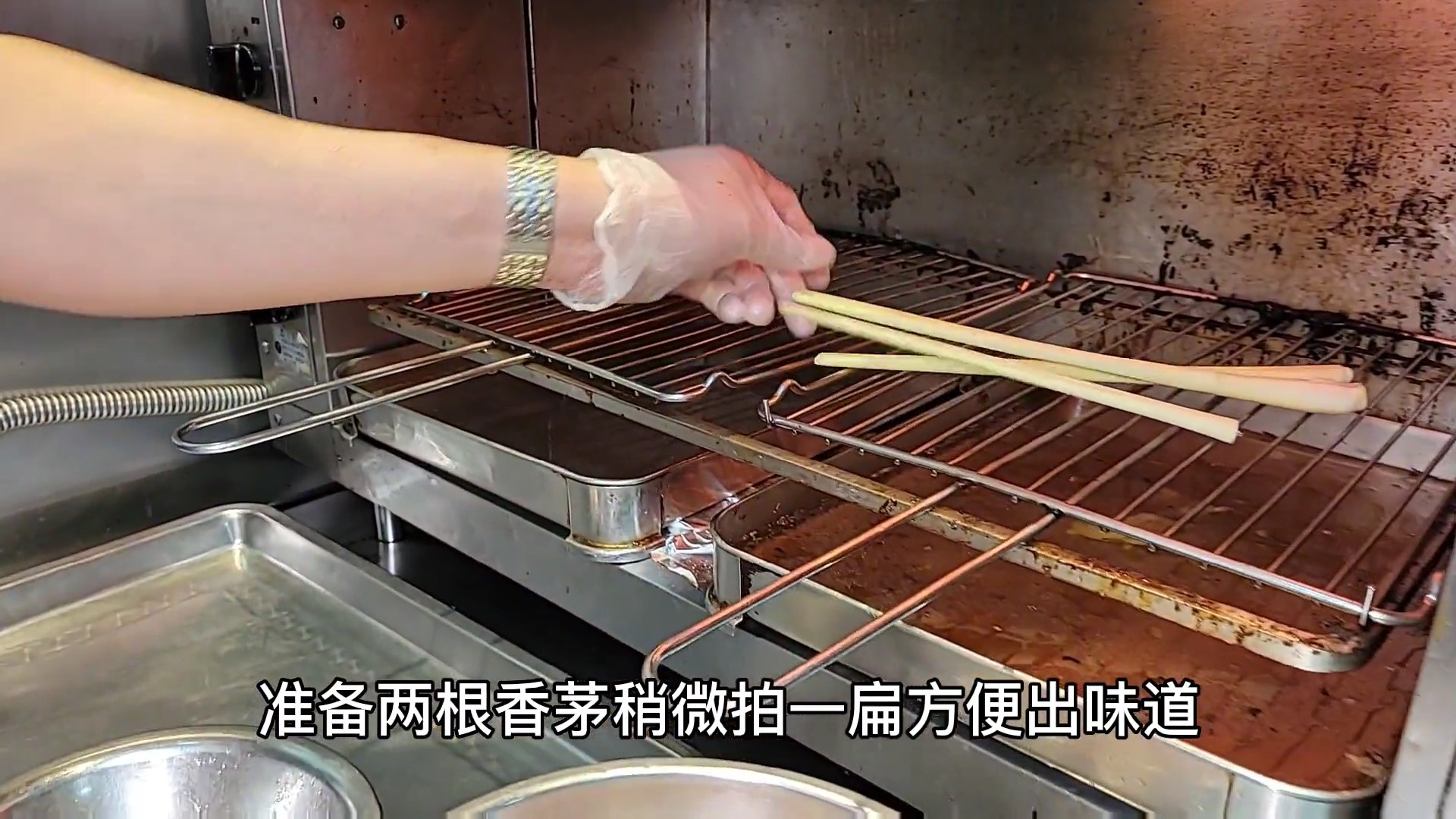 准备两根香茅,稍微拍一点方便出味道,再把刚才腌好的牛肋骨放入烤箱中烘烤,20分钟之后,整个厨房香气扑鼻。