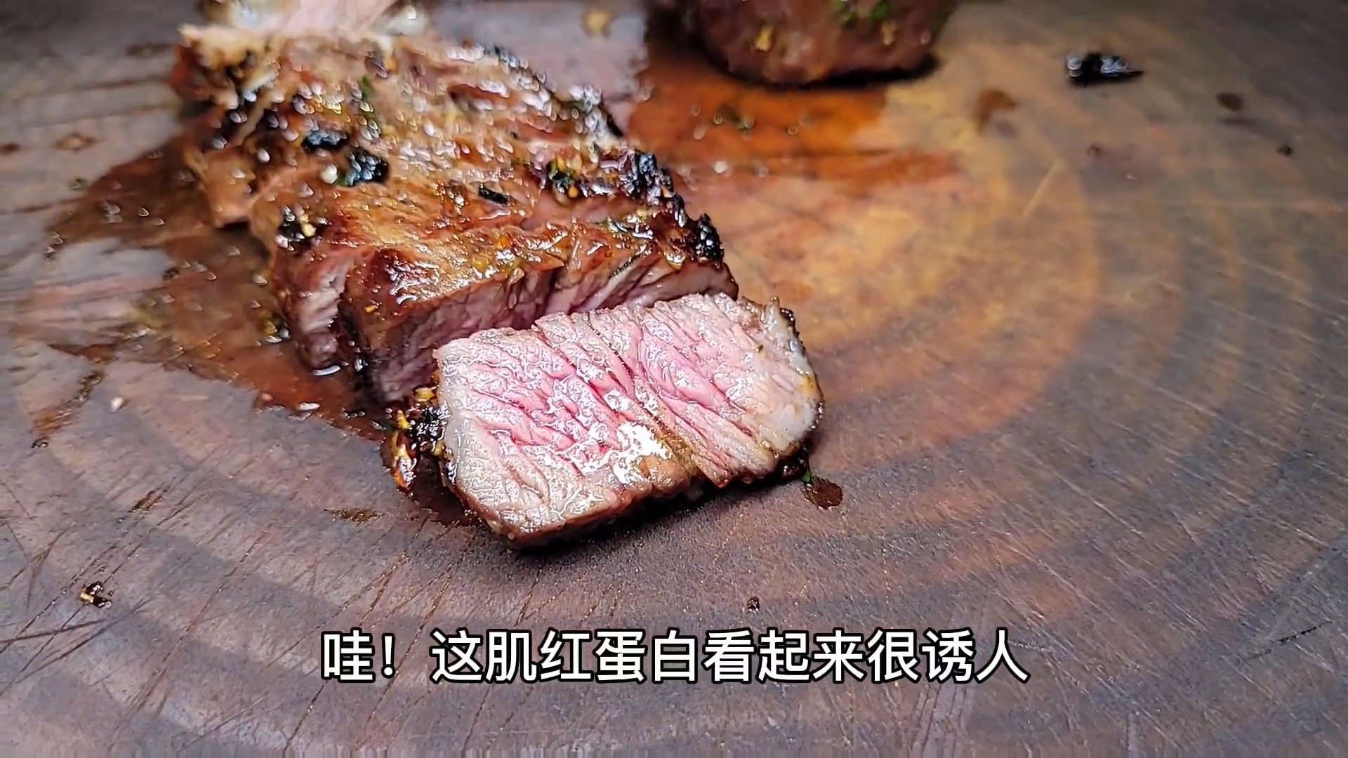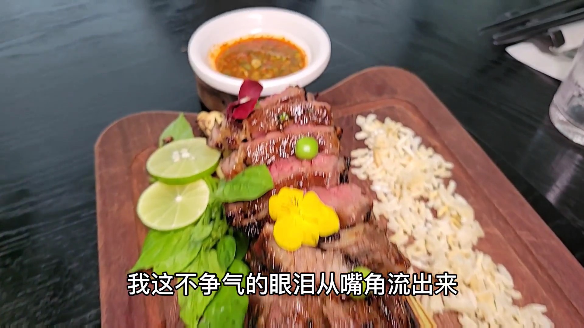 这是各种天然植物的香味混合搭配,这大概是7成熟的标准,这肌红蛋白看起来很诱人,经过师傅的简单改刀,再加上工整的摆盘,最后再精心点缀,我这不争气的眼泪从嘴角流出来。