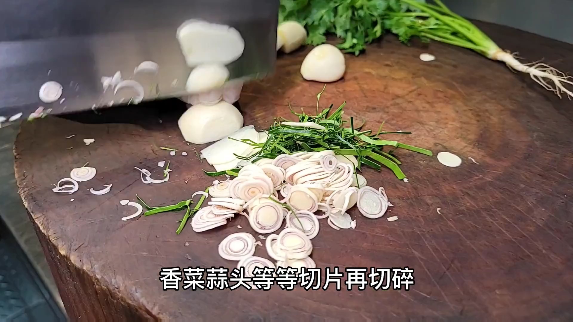 毛根、柠檬叶、香菜、蒜头等等切片再切碎,别小瞧这些香料简单,在这位研发总监的刀下显得出神入化,这可是有30年厨师经验的泰国师傅,给我多10年都练不了这个功夫。