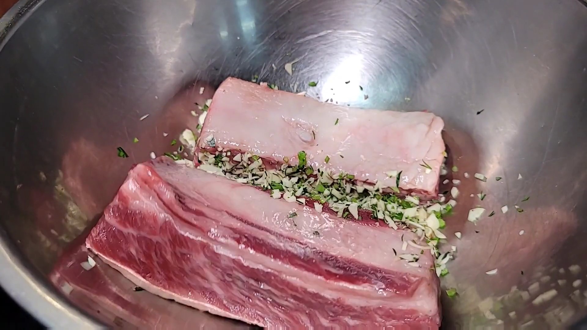把所有香料切碎放入盆中,加入改好刀的牛肋骨,再加入泰国师傅研发多年的秘制腌料,充分抓拌均匀上色上味。