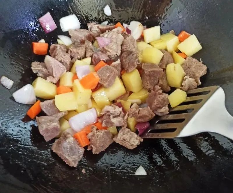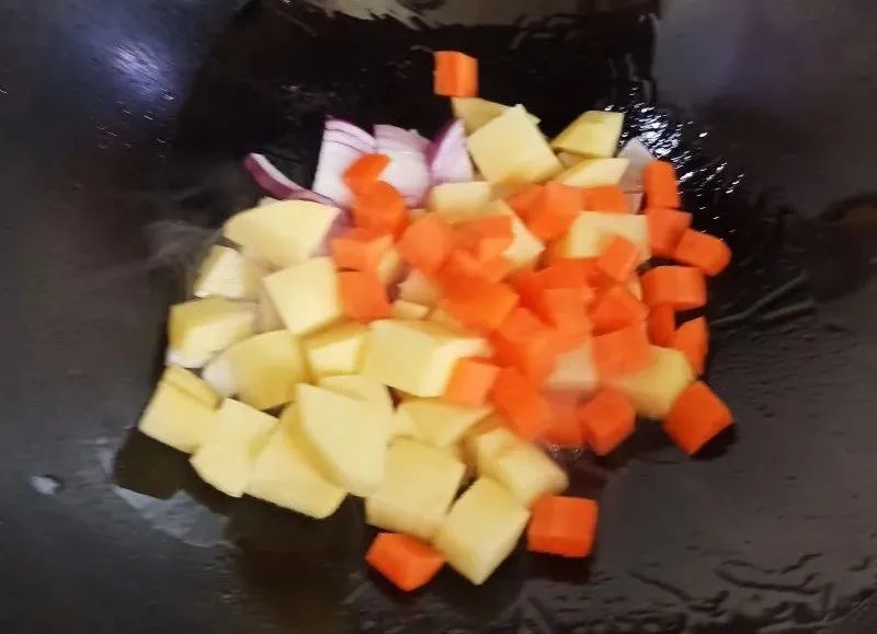 2、锅中放入适量食用油,炒香洋葱、土豆、胡萝卜块。