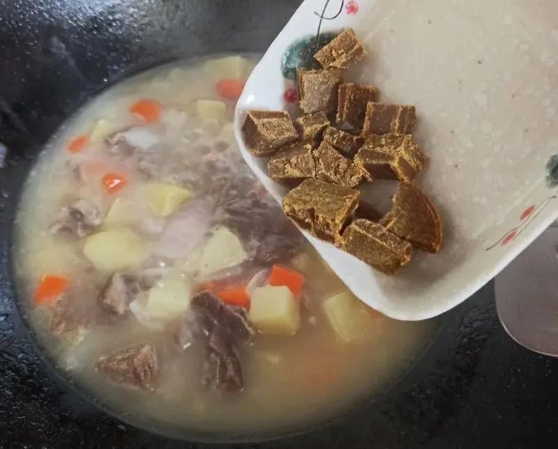 7、加入切成小块的咖喱块。
