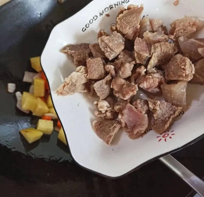 3、加入牛肉块。