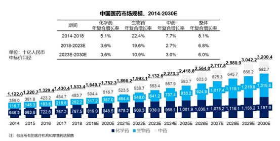 人类有健康需求,医药行业是一个永远的朝阳产业。在老龄化,社会医疗卫生支出和研发投入等因素的共同影响下,全球医药市场保持着稳定增长,根据Frost&Sullivan预测,全球医药市场规模将会于2023年达到1.6万亿美元,于2030年进一步攀升至2.1万亿美元。2018年,我国医药市场规模达到1.5万亿元。根据Frost&Sullivan预测,我国医药市场将会在2023年达到2.1万亿元。