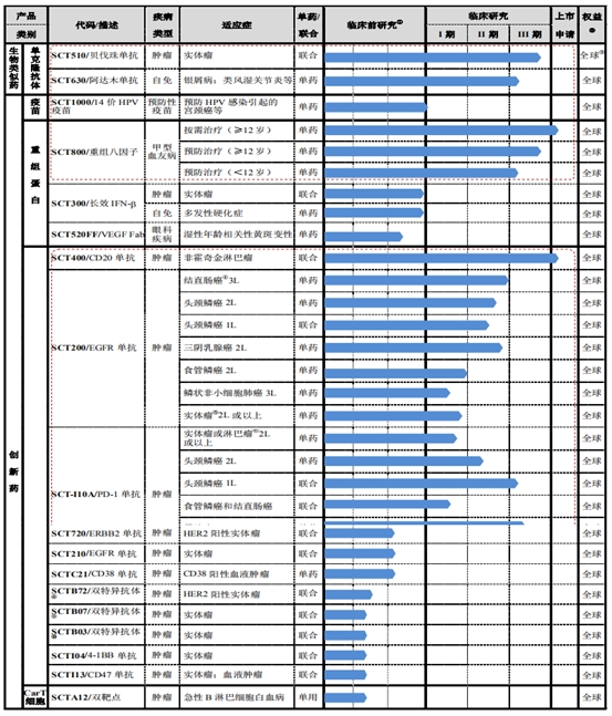 公司产品管线布局丰富,梯队合理,包括一系列蛋白药物、抗体药物和基因工程疫苗,适应症涵盖肿瘤、自身免疫系统疾病、遗传病和感染性疾病等,公司多个产品目前处于临床研究I、II、III期阶段。截至2020年5月,公司独立自主研发的处于临床阶段和临床前研究阶段的生物药产品管线包括21个创新药品种和2个生物类似药品种,正在开展7项III期临床研究、5项II期临床研究、6项I期临床研究、2项临床研究准备工作以及16项临床前研究。公司核心竞争产品品种包括已进入临床试验阶段的SCT800(重组凝血八因子)、SCT200(EGFR单克隆抗体)、SCT-I10A(PD-1单抗)和SCT1000(14价人乳头瘤病毒(HPV)疫苗)。