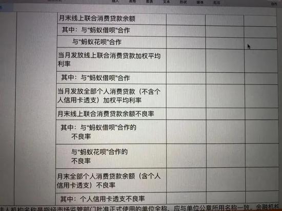 以下为央行要求各银行上报的统计数据,其中,特别区分了蚂蚁花呗和蚂蚁借呗合作的消费贷款余额、不良率、以及平均利率和不良率、信用卡透支的不良率等。