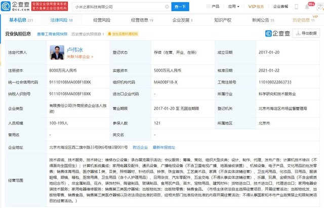 企查查显示,小米之家科技有限公司成立于2017年,法定代表人为卢伟冰,注册资本为8000万元人民币。企查查股权穿透显示,该公司由小米通讯技术有限公司全资持股。