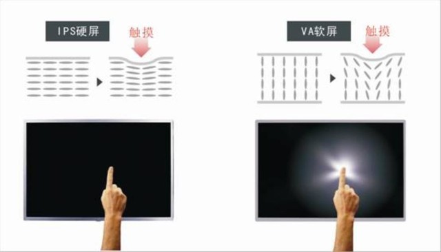物理区别:IPS硬屏分子排列结构为水平排列,而VA软屏的分子排列结构为纵向排列,根据手指按压有水波纹来判断软硬屏即是利用了这一区别。在遇到外力时,硬屏液晶分子结构坚固性和稳定性远远优于软屏。另外,IPS硬屏与VA软屏的分子排列不同,我们可以用放大镜或者用手机对着屏幕拍照,放大后观察液晶分子排列也够,也能观察出硬屏与软屏的不同。