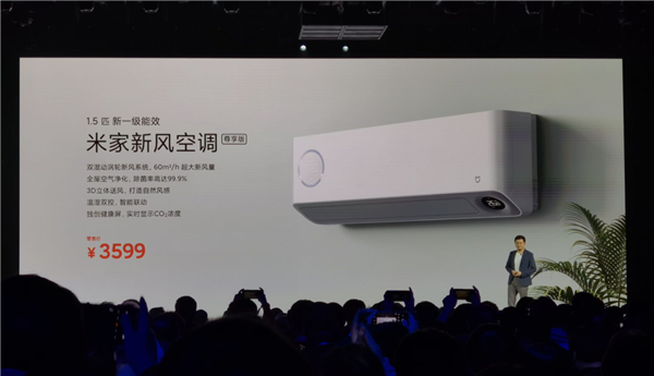 在今晚的小米发布会上,小米推出的第二款产品是米家新风空调尊享版,这是一款三效合一的空调——空调+新风机+净化除菌,独创健康屏,可以实时显示二氧化碳浓度。