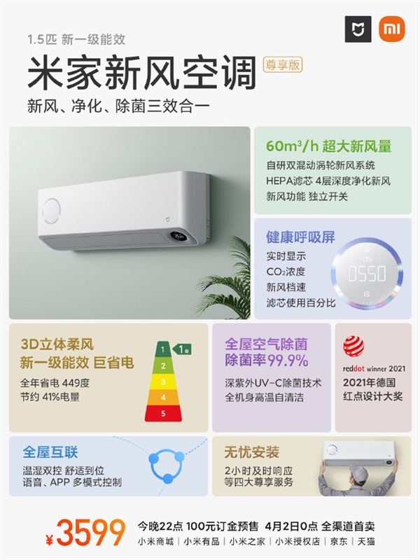 米家新风空调尊享版售价3599元,还有2小时及时响应等四大尊享安装服务,今晚22点100元订金预售,4月2日正式首卖。