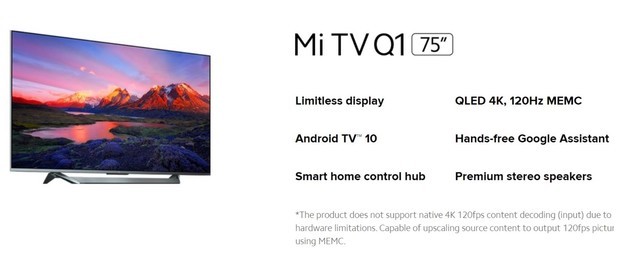 此前,小米面向海外市场推出了一款4K QLED量子点电视,名为Q1 75英寸。支持杜比视界HDR、192分区背光等,性价比相当不错。