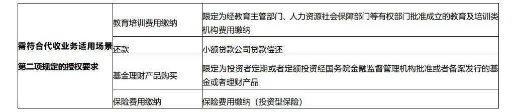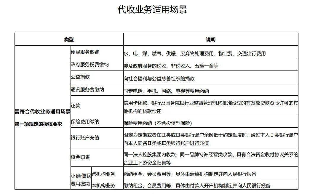 央行在《通知》中明确,符合代收业务的适用场景包括,便民服务缴费、政府服务税费缴纳、公益捐款、通讯服务费缴纳、信用卡还款、保险费用缴纳、银行账户充值、资金归集、小额便民费用缴纳、跨机构业务等等。