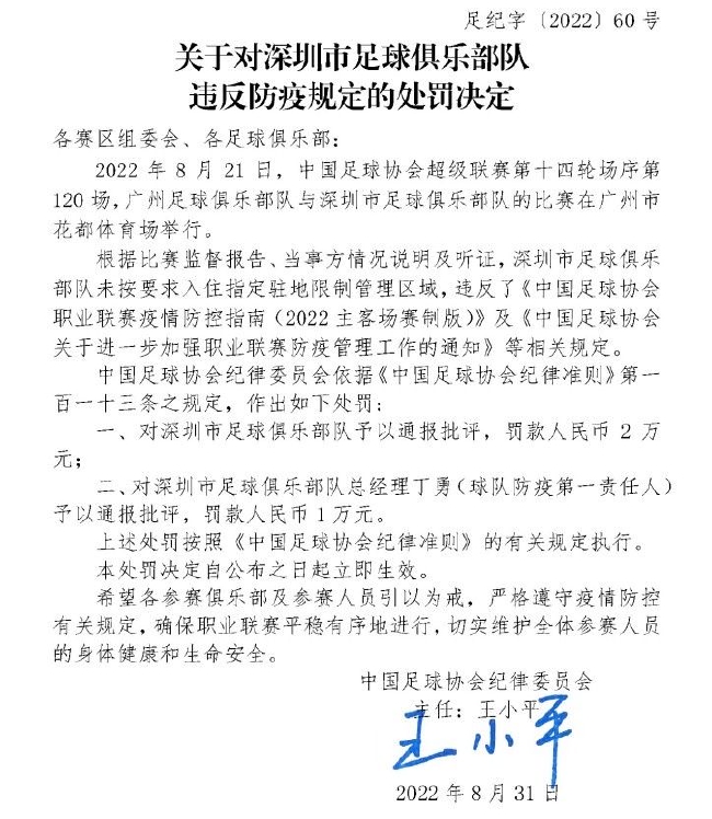 1、中超第14轮深足客场挑战广州队,深足未按要求入住指定驻地限制管理区域,违反防疫规定,足协对深足通报批评并罚款2万元,对深足总经理丁勇(球队防疫第一责任人)通报批评,罚款1万元。