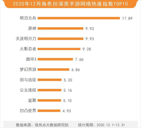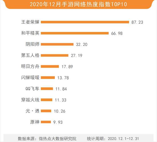 根据微热点大数据研究院数据统计显示,2020年12月,腾讯游戏旗下的MOBA类手游王者荣耀以87.23的热度指数依然稳居手游榜榜首。和平精英和阴阳师分列榜单第二、三位,热度指数分别为66.98和32.20。第五人格、明日方舟、闪耀暖暖、QQ飞车、穿越火线、sky光遇、原神排名四至十位。值得注意的是,穿越火线手游于12月5日迎来5周年庆典,吴磊、宋妍霏、赖美云空降直播间庆生并发布微博为其做宣传,助力穿越火线手游本月热度上涨。