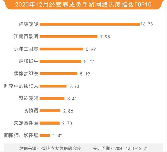 本月经营养成类手游中,闪耀暖暖以13.78的热度指数蝉联该类手游TOP10榜单冠军。江南百景图以7.95的热度指数位列第二名,少年三国志、最强蜗牛、偶像梦幻祭等排名三至五位。