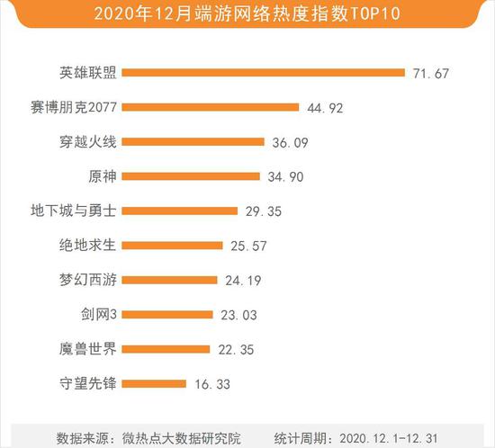 除手游外,端游同样受到众多玩家关注。数据统计,2020年12月,英雄联盟以71.67的热度指数稳居端游榜榜首并依旧保持领先之势,2020英雄联盟全明星赛于12月18-20日在线上进行,职业选手和社区名人都在各自的家中或赛区主场参加比赛,引起玩家广泛关注。本月新游赛博朋克2077以44.92的热度指数位列第二。穿越火线、原神、地下城与勇士、绝地求生、梦幻西游、剑网3、魔兽世界、守望先锋分列榜单三至十位。