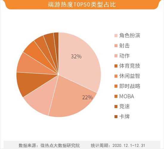 在端游热度TOP50排行中,有16款游戏属于角色扮演类,有11款游戏属于射击类,二者占比分别为32%和22%。可见,角色扮演类和射击类游戏在端游中扮演着重要角色,受到众多玩家的追捧。