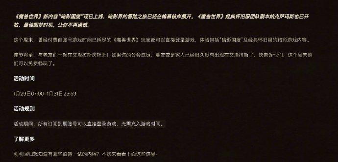 《魔兽世界》免费周末上线,活动时间为1月29日07:00~1月31日23:59。