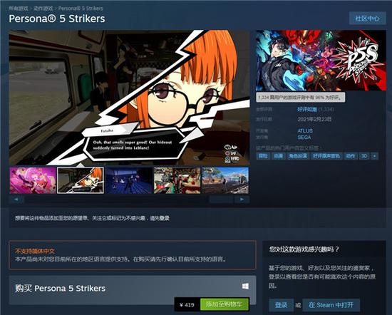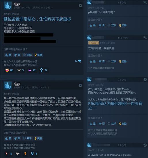 从此次的玩家评测细节来看,玩家们认为Steam《女神异闻录5S》键位设置很贴心,战斗流畅,画风、音乐都很棒,一些玩家甚至给出天下第一的评价。不过,游戏会有一定闪退的情况,有一定UI锯齿感,400多的价格偏贵。