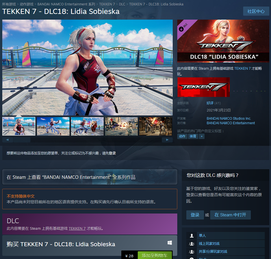 目前,《铁拳7》DLC18“波兰女总理”、DLC19“海岛天堂”已经正式登陆Steam平台,其中“波兰女总理”DLC售价为28元,“海岛天堂”DLC售价为18元。