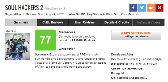 《灵魂骇客2》媒体评分现已解禁,M站均分77(PS5版,评分媒体最多),GameSpot和IGN都为该作打出7分评价。《灵魂骇客2》将于8月25日登陆PS5、PS4、Xbox Series X|S、Xbox One、Steam(8月26日),支持中文。
