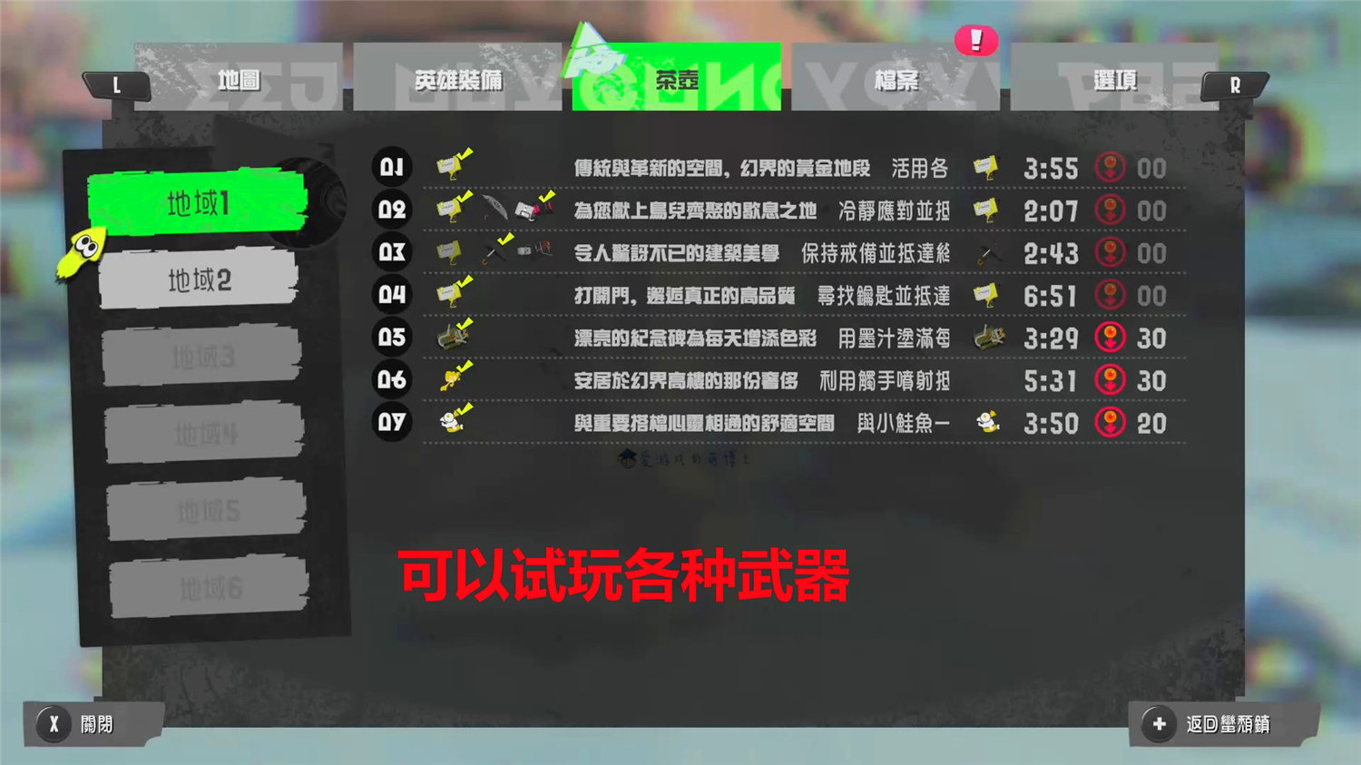 博士上面说了《斯普拉遁3》的操作并不简单,因此游戏里的单人模式(英雄模式)非常适合大家来熟悉游戏的基本操作和规则。单人模式中的每个关卡都有特定的主题,可以让你熟悉一种武器或是一个动作,在玩的过程中,你可以选择自己喜欢或者擅长的武器。可以说,单人模式是《斯普拉遁3》里的教学关卡,内容又非常有趣,可以多玩玩。