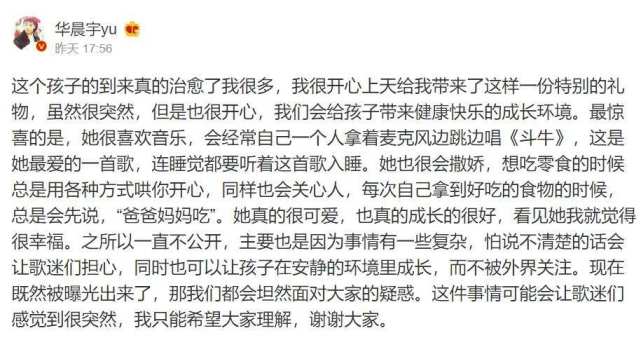 郑爽的事情还没结束,华晨宇与张碧晨隐婚有小孩的消息就被网上爆了出来。经过吃瓜网友一天的热议,张碧晨和华晨宇先后承认了有一个共同的女儿,张碧晨还发长文说孩子是她自己一个人决定生下来的,而华晨宇并不知道。孩子出生后,华晨宇才知道此事。