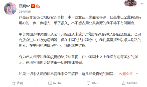 今年1月18日,张恒自曝和郑爽在美国代孕了两个孩子,次日,郑爽发布微博, 一再申明她的行为经得起任何法律的考验,在中国没有违反法律,在国外也尊重法律法规,还率先举起法律武器维权,两人抚养权案中,确实是郑爽起诉的张恒。可见,郑爽的法律意识确实还是很强的。